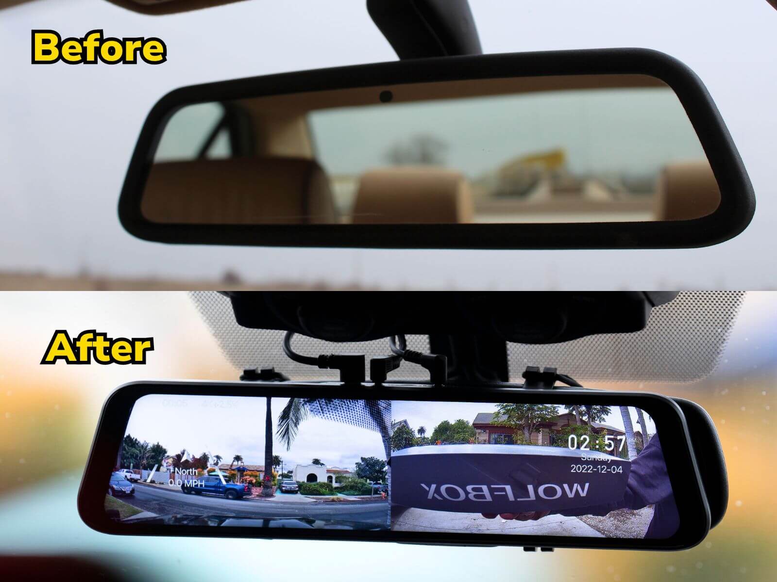 Unique design meets driving savvy with the compact WOLFBOX Mirror Dash Cam.